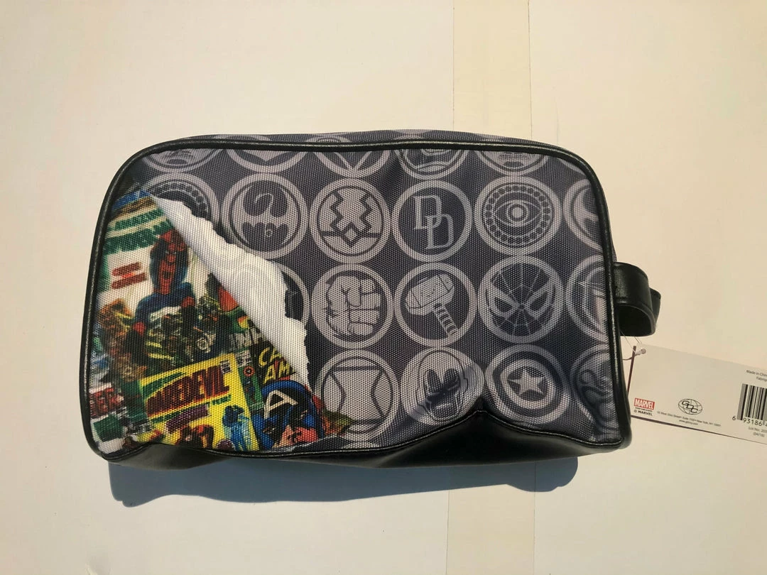 Marvel accessory or toiletry bag. Zipper enclosure with amazing detail. Features various Hero’s  logos with the corner “ripped” up to show vintage comic covers. With leather sides and bottoms this is a great high quality bag. Measures 8 1/2” wide, 5 1/2” tall.
