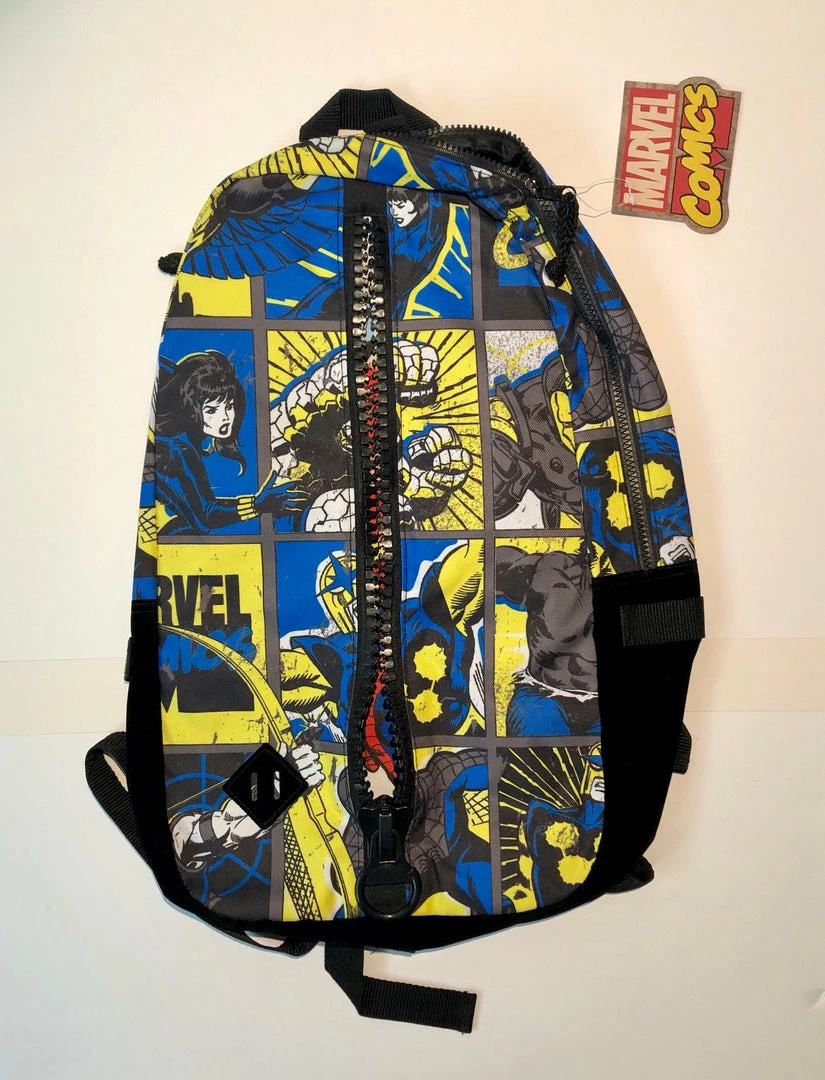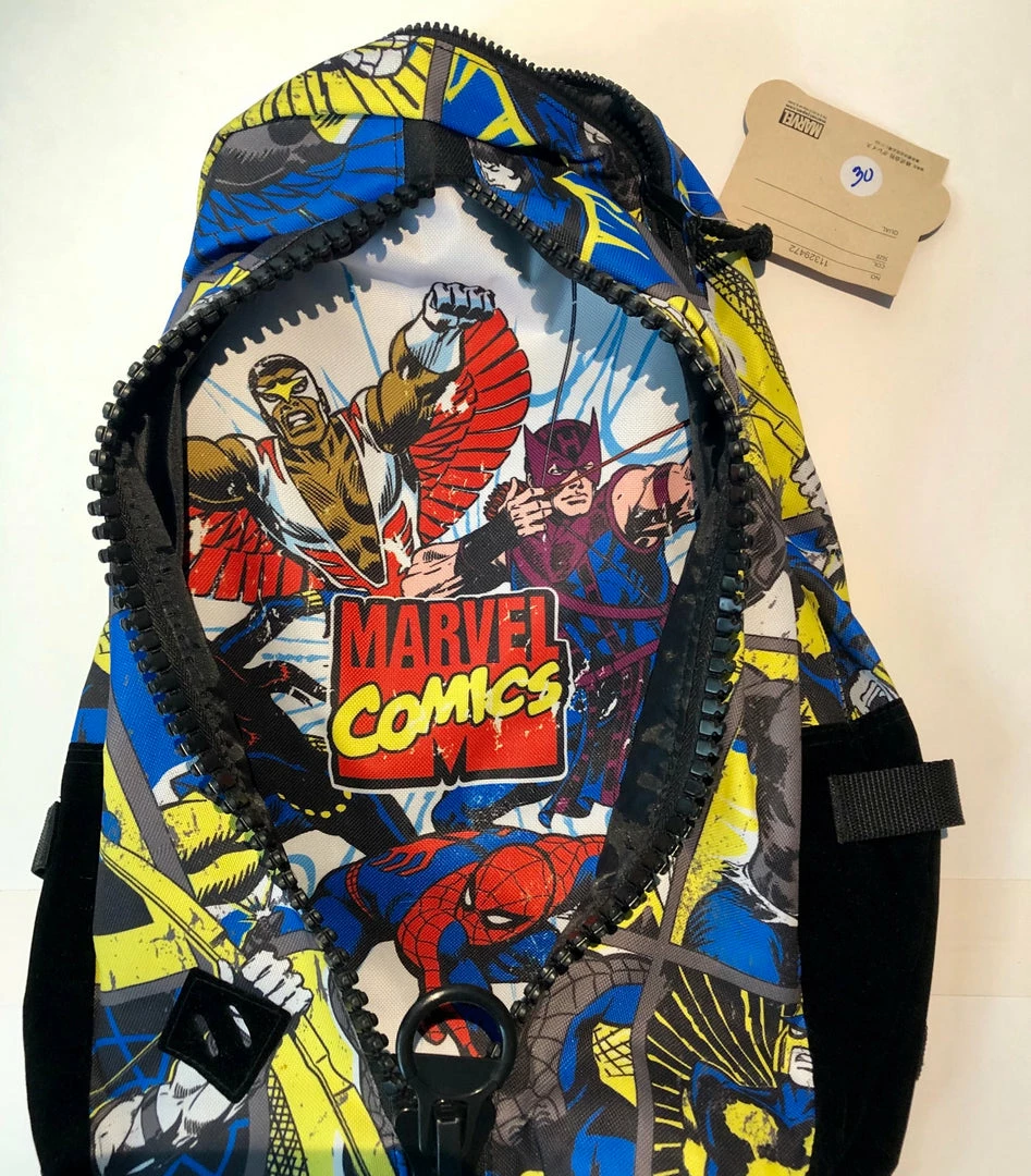 Marvel Comics Backpack featuring Black Widow, The Thing, Iron Man, Nova, The HULK, Spider-Man, Hawkeye and Falcon in grey scale on the outside. With a vertical zipper open full color artwork on the inside shows Hawkeye, Black Widow, Spider-Man and Falcon along with the Marvel Comics Logo. Also has the traditional main compartment. The bottom of the bag features felt for a unique look. Great item!!!!