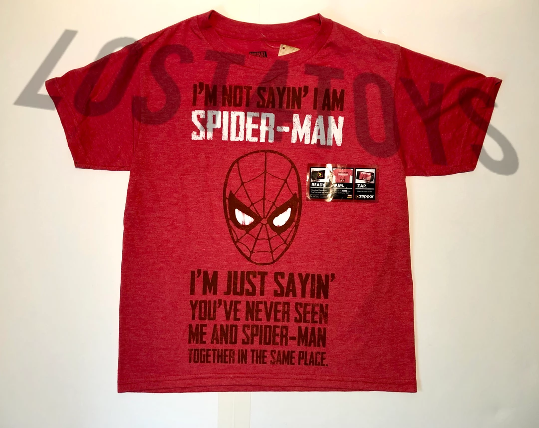 Marvel Kids Spider-Man Tee. “I’M NOT SAYIN’ I AM SPIDER-MAN I’M JUST SAYIN’ YOU’VE NEVER SEEN ME AND SPIDER-MAN TOGETHER IN THE SAME PLACE” Also Marvel partnered with the app Zappar and when you use the app there’s a cool interactive result.