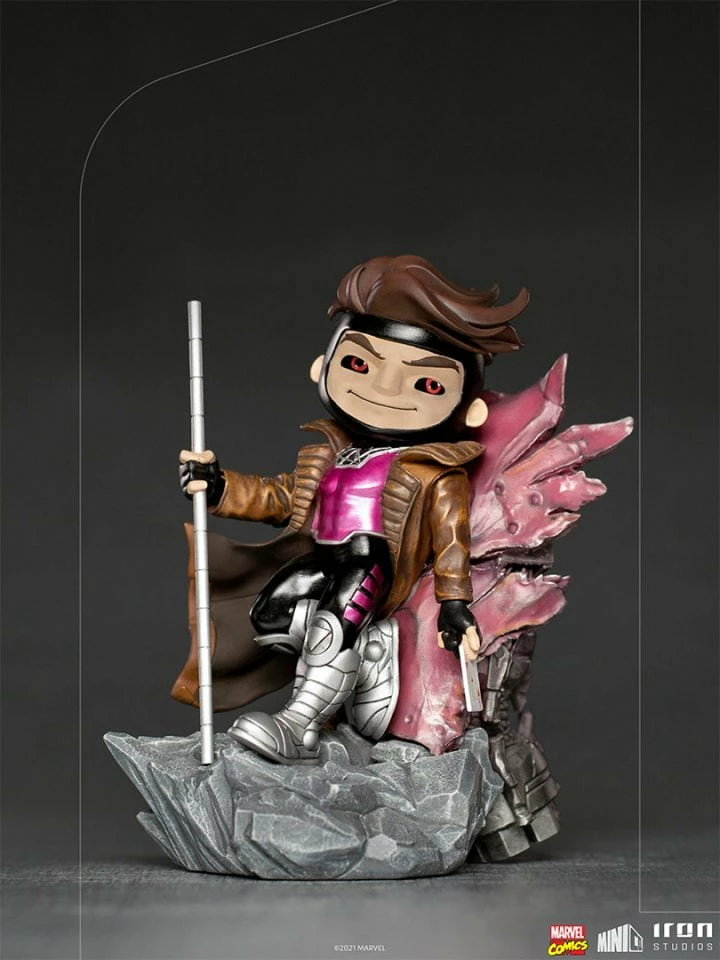 The ”Gambit – X-Men – MiniCo – Iron Studios” statue features the charismatic Cajun mutant leaning on the metallic remains of a Sentinel, his inseparable staff in hand and holding an Ace of Hearts playing card. In a seemingly relaxed mood after a good fight, he flirts with his fellow group member Rogue, with whom he has fallen in love, in a mutual feeling. Recruited by heroine Storm to join the X-Men, Gambit is Remy LeBeau, a very powerful mutant who can manipulate kinetic energy. He is also skilled at throwing cards, wrestling, and using his staff, as well as being an accomplished poker player.