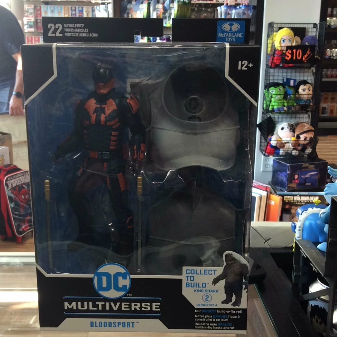 From TMP/McFarlane’s Toys. Designed with Ultra Articulation with up to 22 moving parts for full range of posing and play, each of these 7″ figures Includes a collectable art card with comic book artwork from on the front, and a character biography on the back. Figure includes 1 to 4 build-a components. When combined with the remaining parts, will you can assemble King Shark! Collect Harley Quinn, Bloodsport, Polka Dot Man, and PeaceMaker.