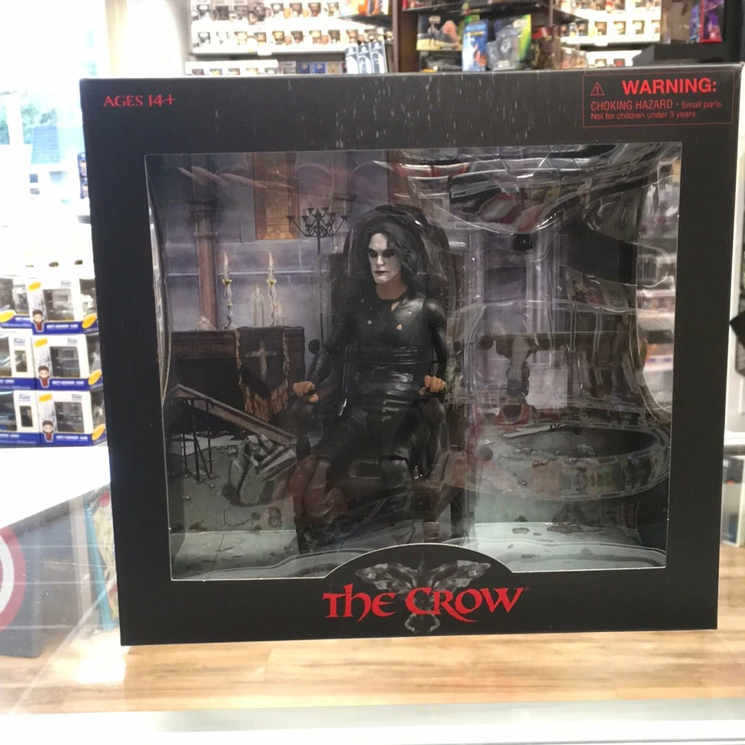 From Diamond Select Toys. Capturing the famous image of Eric Draven sitting in an ornate chair on the set of The Crow, this San Diego exclusive box set includes a fully articulated Eric Draven action figure, an exclusive chair accessory, and the titular Crow. The 7-inch action figure features detailed sculpting and over 16 points of articulation. It comes packaged in a full color window box and is designed by Yuri Tming, sculpted by Eric Dahlberg. Limited to 5000 pieces.