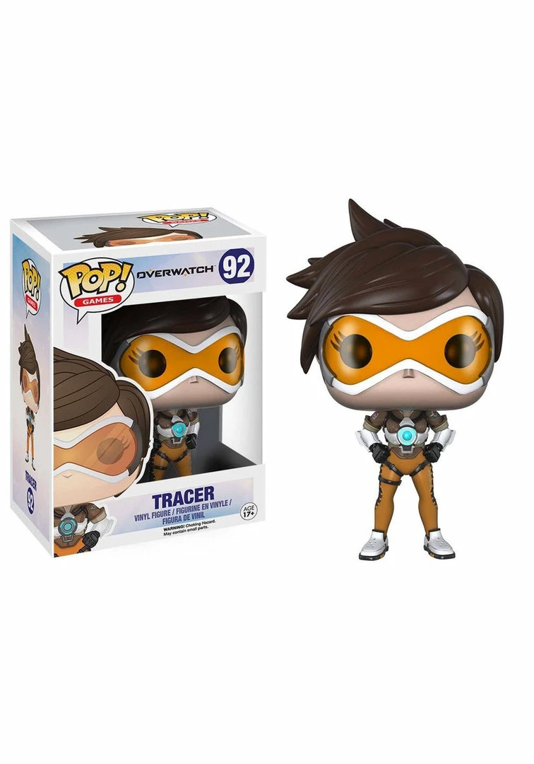 From Over watch, Tracer, as a stylized POP vinyl from Funko! Figure stands 3 3/4 inches and comes in a window display box. Check out the other Over watch figures from Funko! Collect them all!.