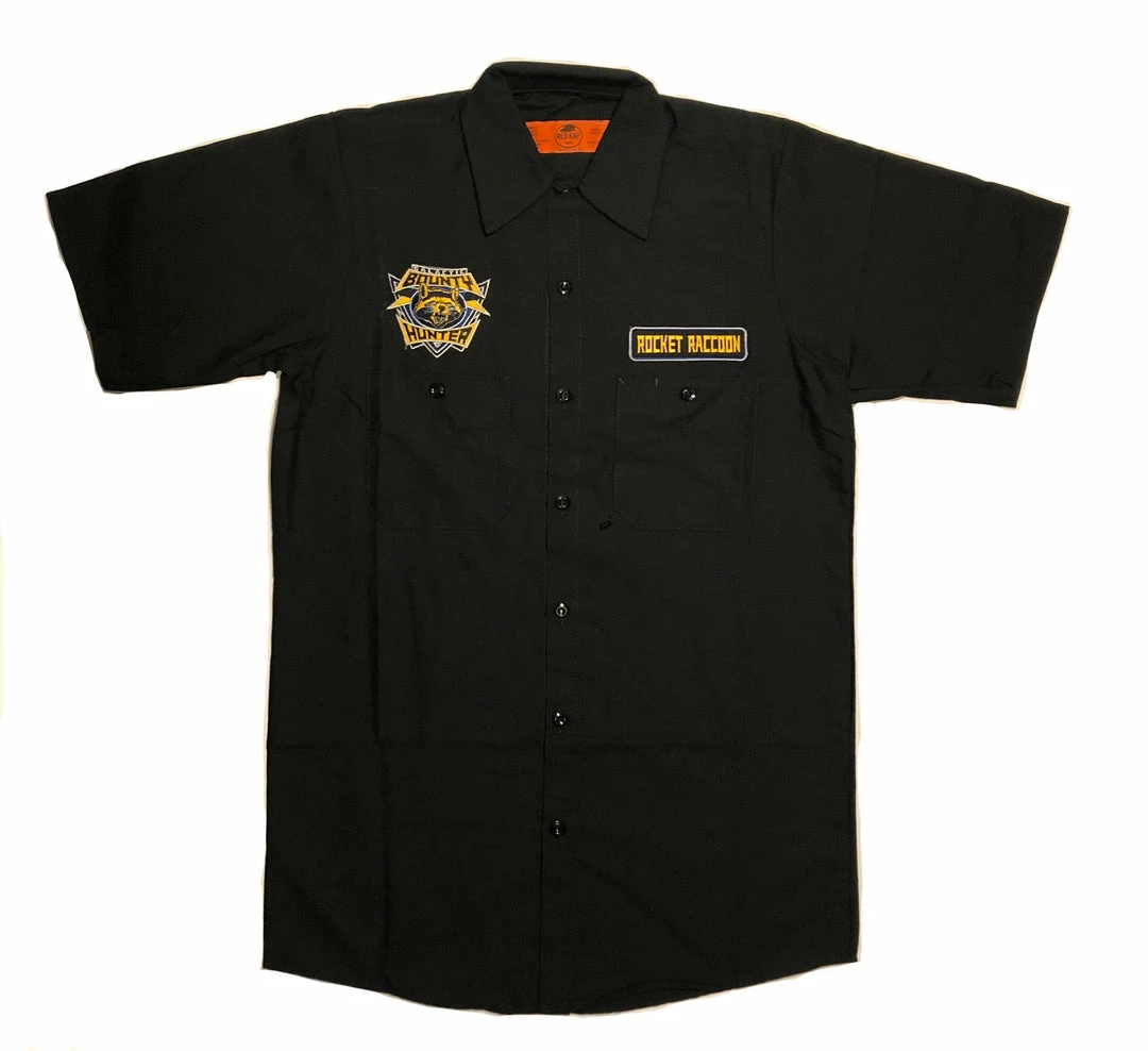 From Red Kap is this stylish button up, collared work shirt featuring ‘Galactic Bounty Hunter’ w/ Rocket’s face above the right chest pocket and ‘Rocket Raccoon’ name above the left chest pocket. Images are stitched on.