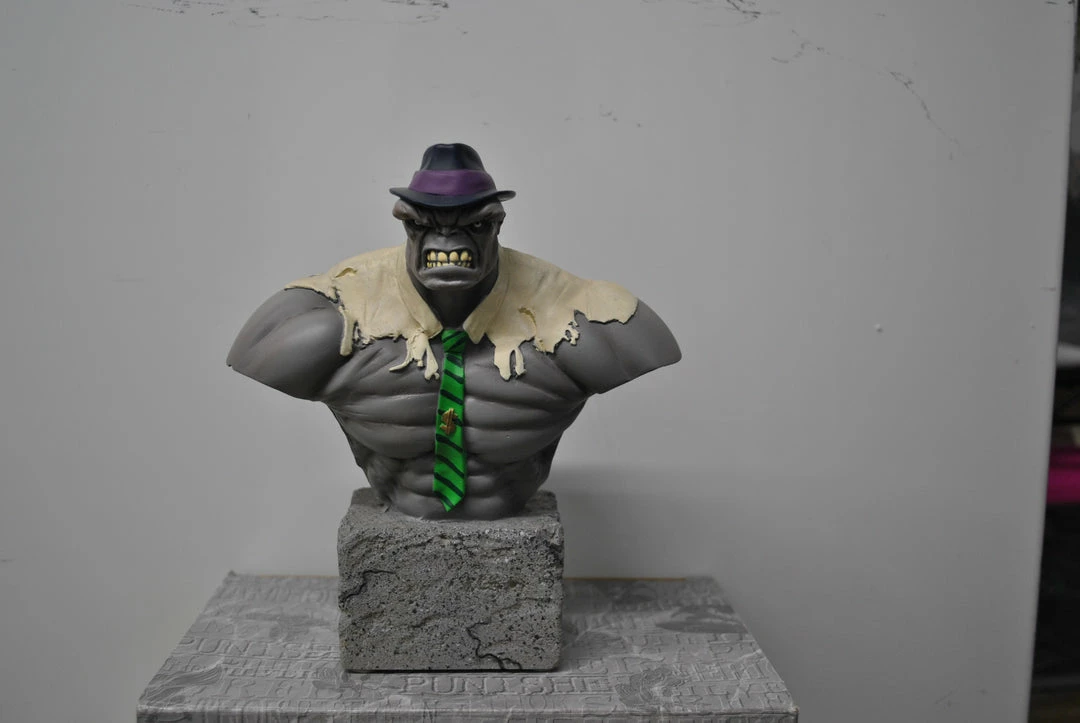 A Bowen Designs Sculpt! The Las Vegas casino bouncer known as “Mr. Fixit” presents a scary, intimidating visage, as well he should – he’s the Grey Hulk! The smart, sarcastic aspect of the Incredible Hulk’s personality, the Grey Hulk comes home in this 6 1/2″ tall mini-bust sculpted by master craftsman Randy Bowen. Painted and ready to display.