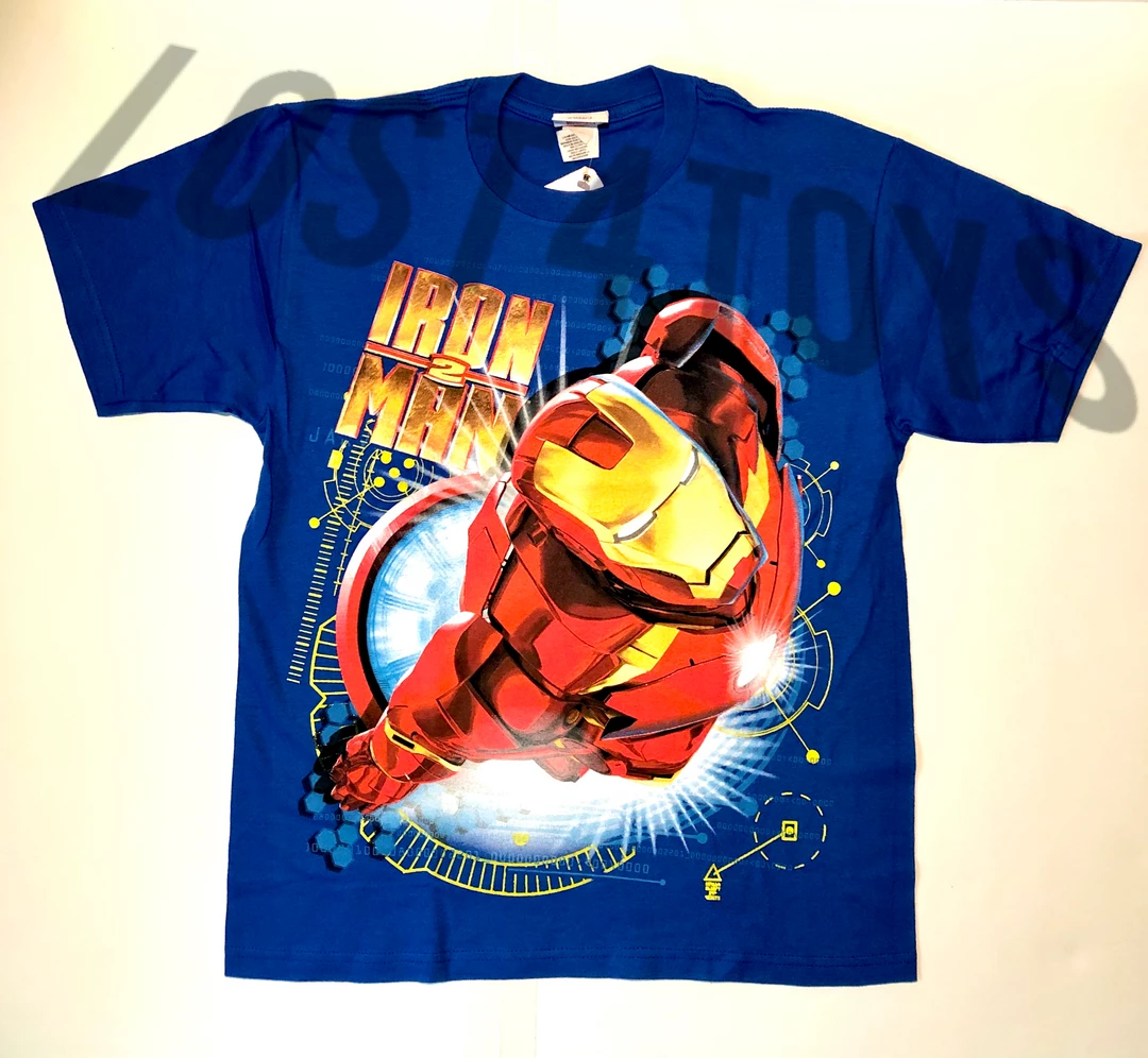 From brand Mad Engine is this Kids Tee featuring Iron Man from the movie Iron Man 2. Iron Man is in flight with some cool techie style designs in the background.