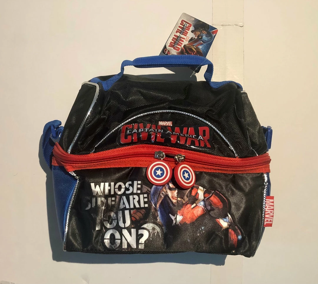 Marvel Captain America Civil War insulated lunchbox. Features the movie logo on the top half, a split image of Captain America and Iron Man on the bottom with the words “Who’s side are you on”. This opens at the middle with a dual zipper enclosure with the top lifting back.