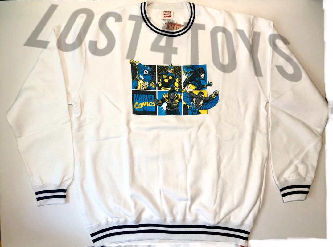 Marvel Crewneck sweatshirt featuring Captain America, Falcon, Luke Cage, Nova and Black Widow. Black stripes along waistband, collar and cuffs.Â