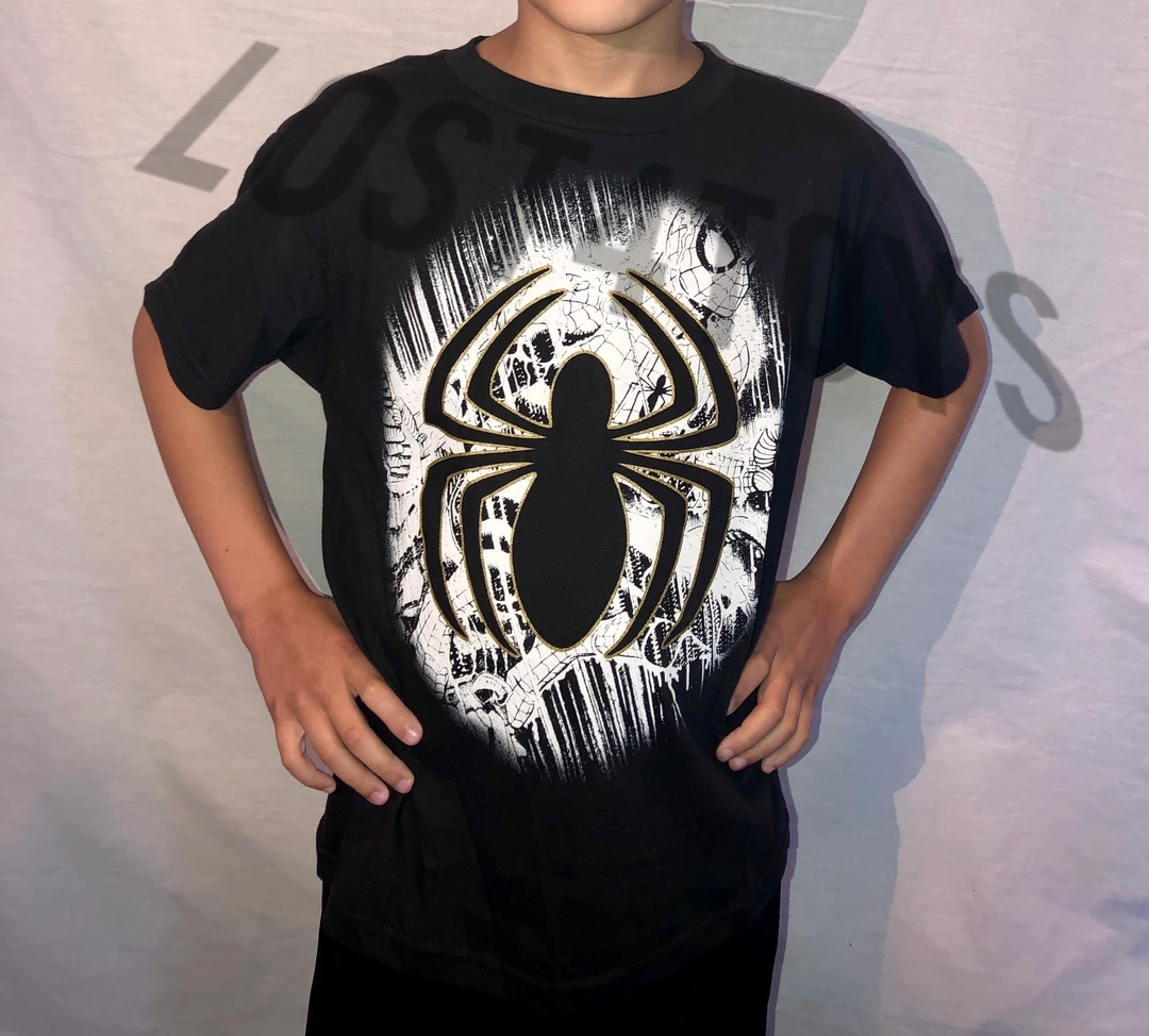 Marvel Kids Spider-Man T-Shirt featuring a black and white image of Spider-Man with a sold black Spider Logo w/ Gold border in the center.Â