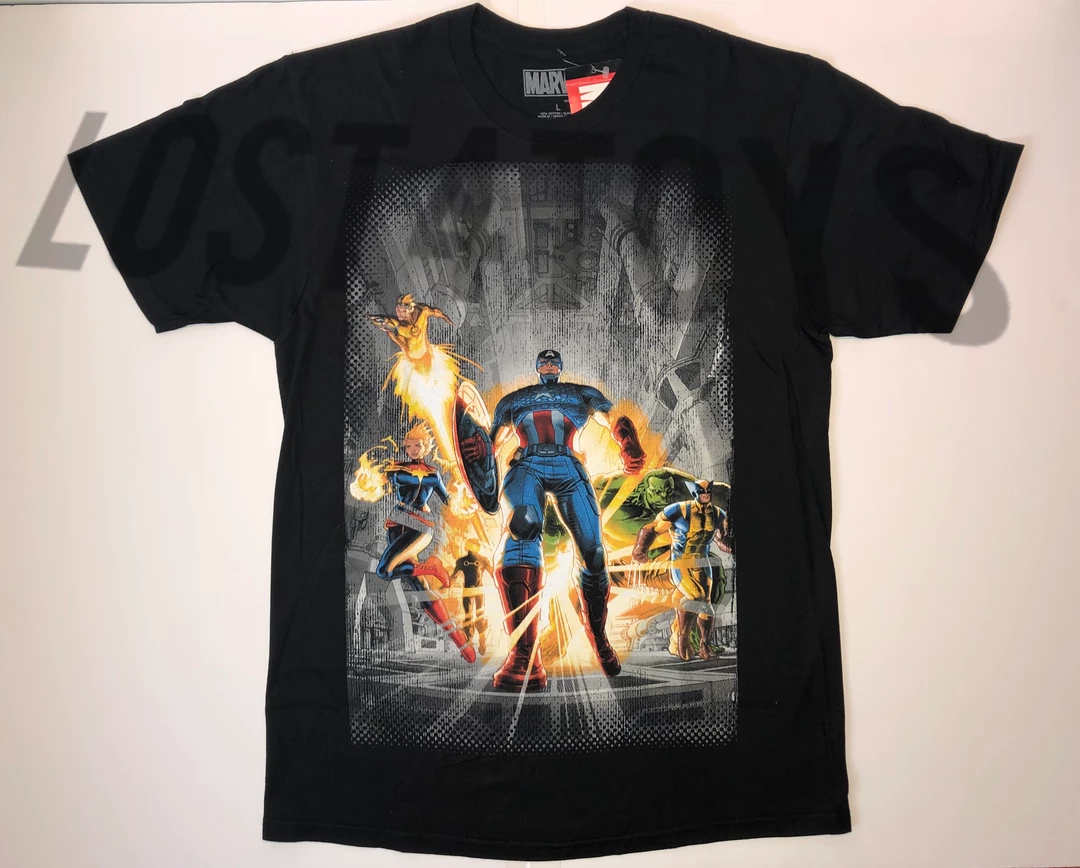 Marvel Men’s tee featuring characters from the New Avengers; Captain America, Wolverine, HULK, Cannonball, Captain Marvel.