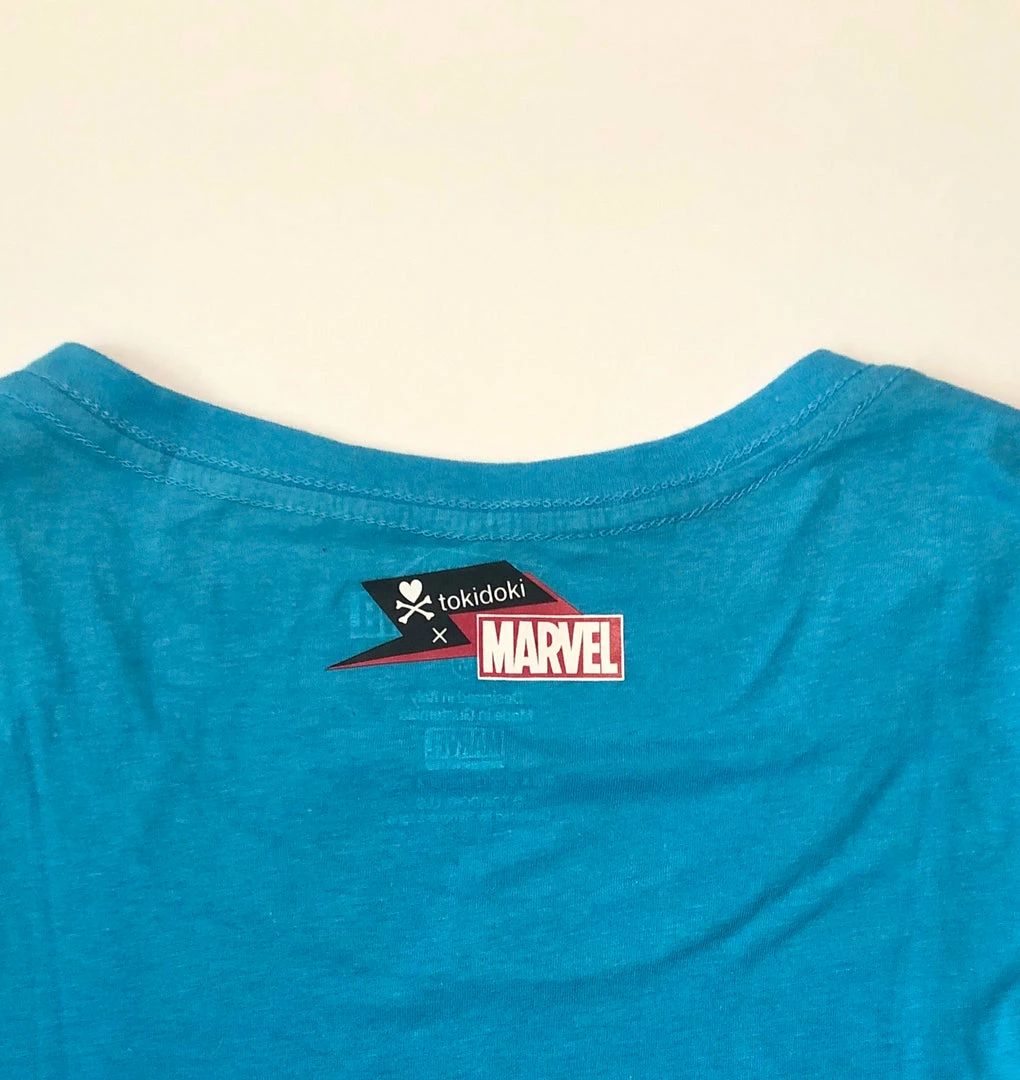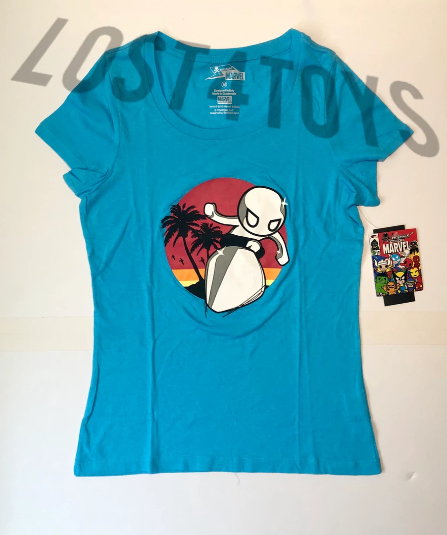 tokidoki brand Marvel Women’s T-Shirt featuring the Silver Surfer with a sunset background.