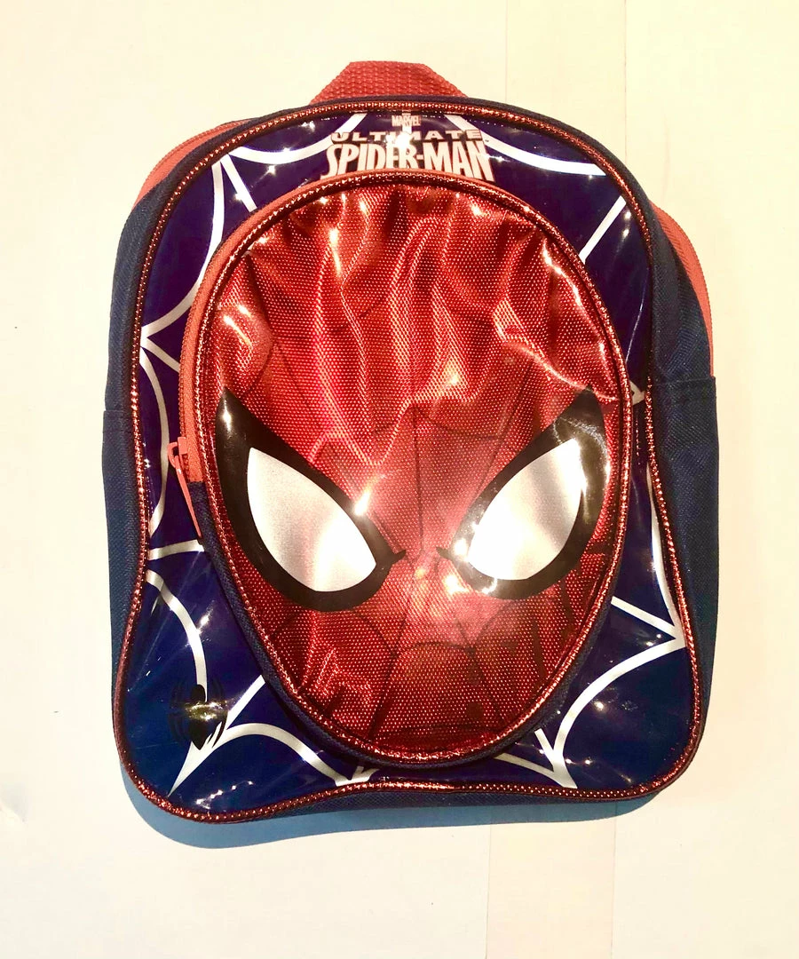 Marvel Ultimate Spider-Man kids/toddler backpack. Has a metallic/reflective image. The Spider-Man face is also a front pouch for additional storage.
