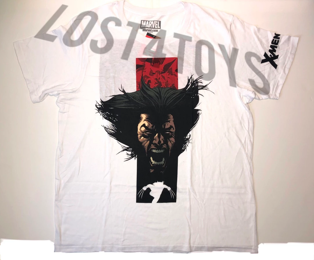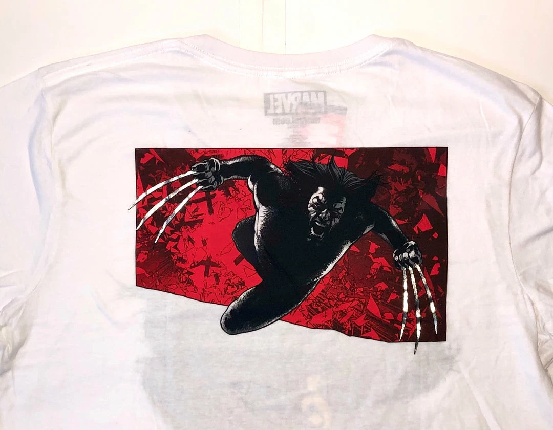 Marvel Wolverine Two-Sided Men’s S/S Tee. On the front is Wolverines’ face and below his silhouette, on the back is Wolverine attacking and the claws are metallic. Also on the left sleeve says ‘X-MEN’