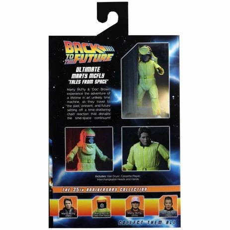 It’s time to hop in the time machine and go back to 1955! NECA is thrilled to present the Ultimate Tales From Space Marty McFly from Back To The Future featuring the official licensed likeness of Michael J. Fox. Equipped with a hair dryer and brain melting device known as a cassette player, Marty is dressed in a hazmat suit with interchangeable heads & hoods to portray his appearance as the visitor from planet Vulcan. Window box packaging.Back to the Future Marty McFly Action Figure [Ultimate Tales From Space]