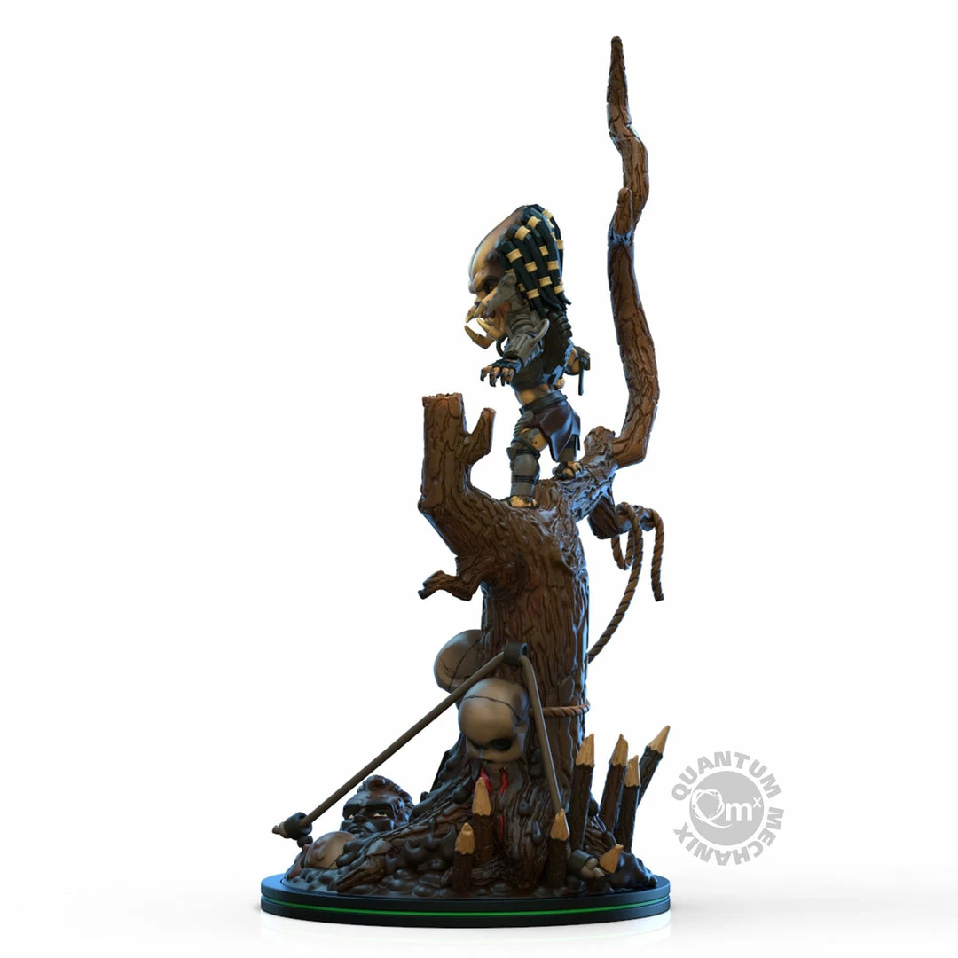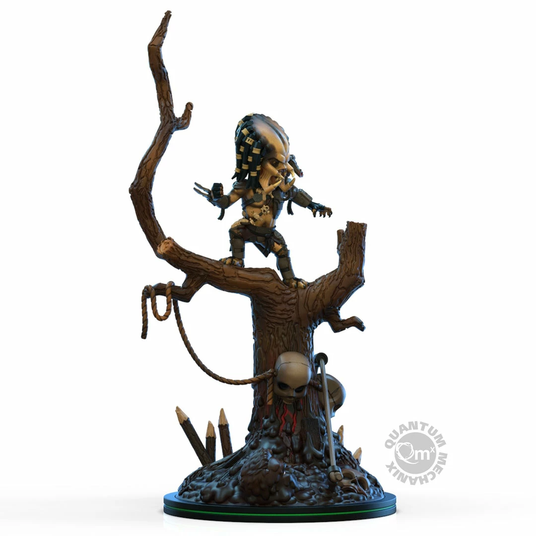 The Predator Q-Fig Max Elite stands nearly 8 inches tall from the muddy and skull-adorned display base to the very top of the gnarled and knotted tree. With a keen eye, you’ll be able to spot Dutch hiding the mud below and waiting for the right moment to strike. Up above, Predator stands at the ready, armed with a wrist blade and flashing razor-sharp mandibles. He wouldn’t be the Predator if he wasn’t sporting those signature alien dreadlocks, either.Â