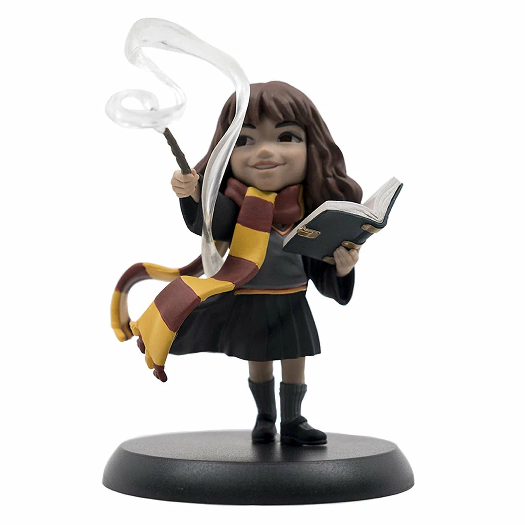 - This cute Q-fig depicts Hermione wearing her school uniform with her Gryffindor scarf blowing in the breeze. As usual she has a book in her hand; a translucent magical wisp comes from her wand as she casts a spell for the first time.