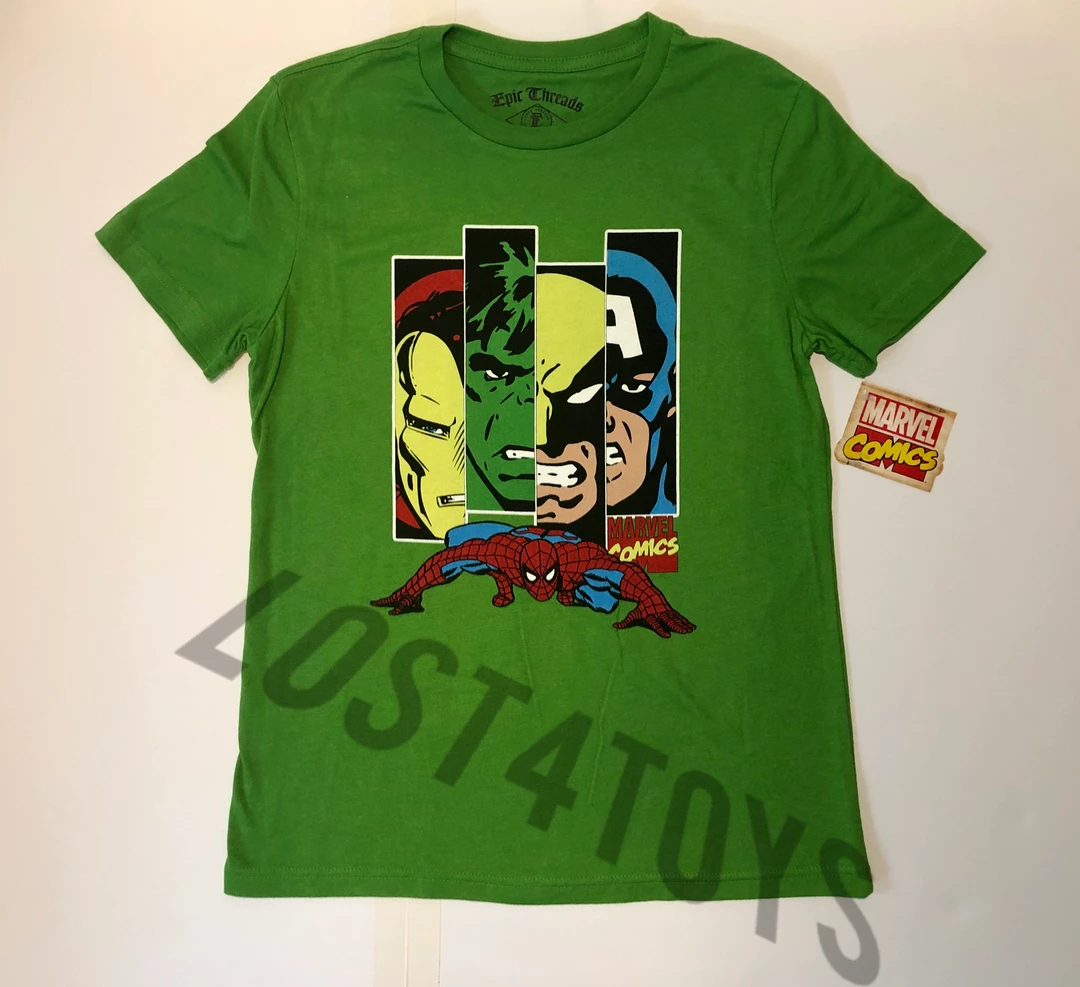 From Epic Threads is this Marvel Kids T-Shirt featuring Spider-Man, Iron Man, Hulk, Wolverine and Captain America.