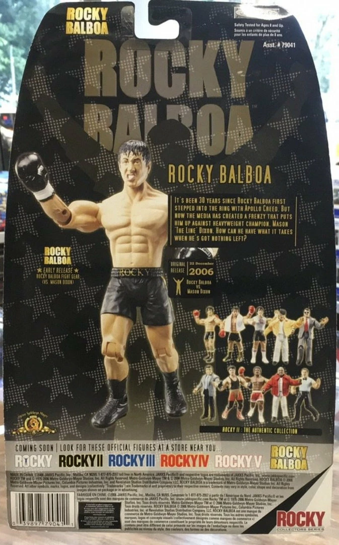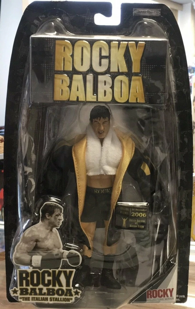 Take a flashback in time with this awesome detailed Rocky Balboa figure. This collectible replicates Rocky in his fight against Mason Dixon, sporting his cool black and gold robe with his black leather gloves and white towel. Definitely a great addition for you Rocky fanatics! Not for children under 3 years old.